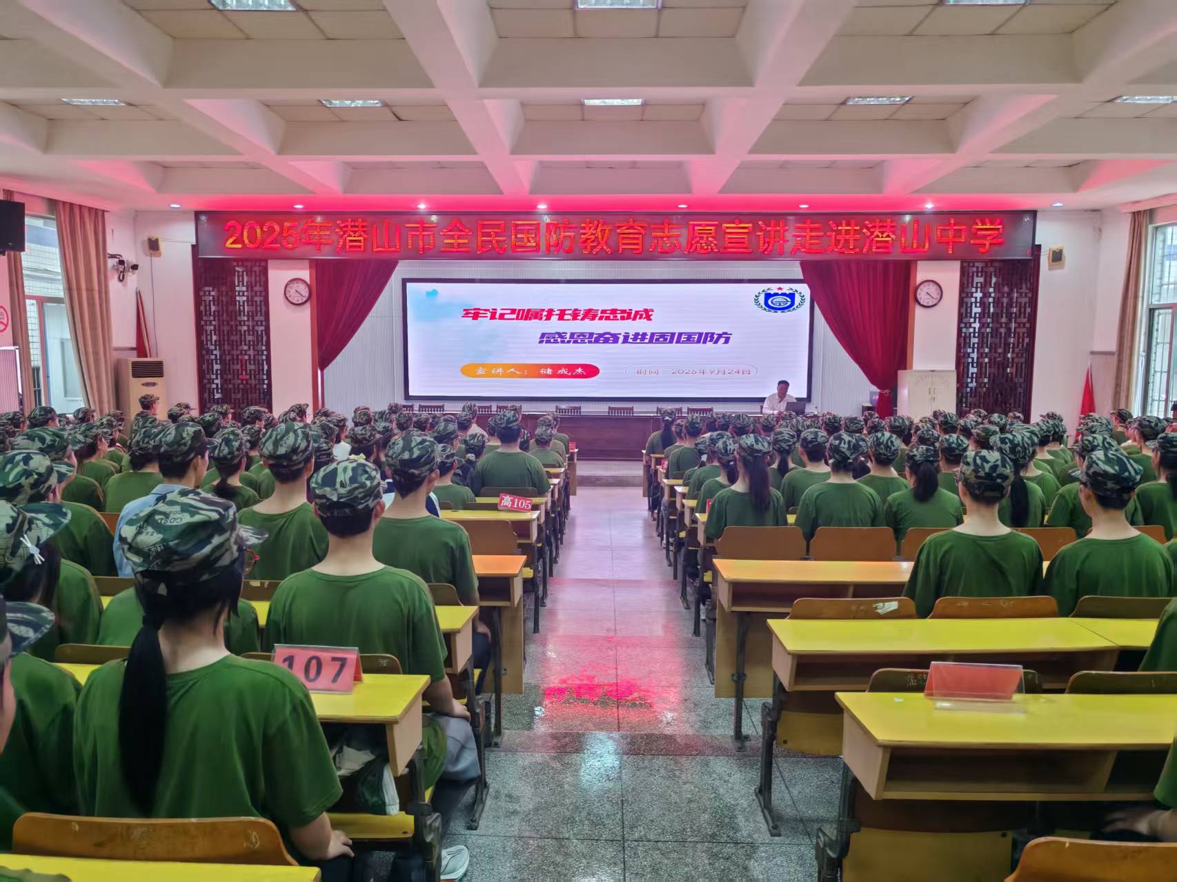2025年9月24日,潜山市全民国防教育宣讲活动在潜山中学举行。潜山市教育党委委员、潜山市全民国防教育宣讲团讲师储成杰主任以“牢记嘱托铸忠诚 感恩奋进固国防”为主题,为师生带来了一场生动的国防教育课。